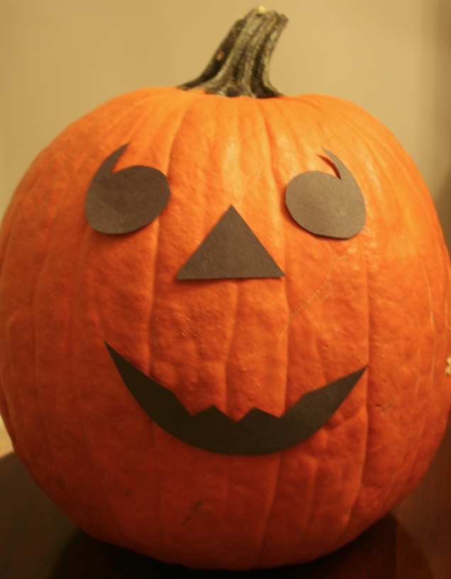 After I decorated the pumpkin, using double-sided tape and black construction paper, I decided I really liked his face. It doesn't depress me at all. I also think my pumpkin is very fitting for Halloween. It is my joke. Instead of the pumpkin being scary to people, people are scary to my pumpkin. Silly, for sure, but funny to me.